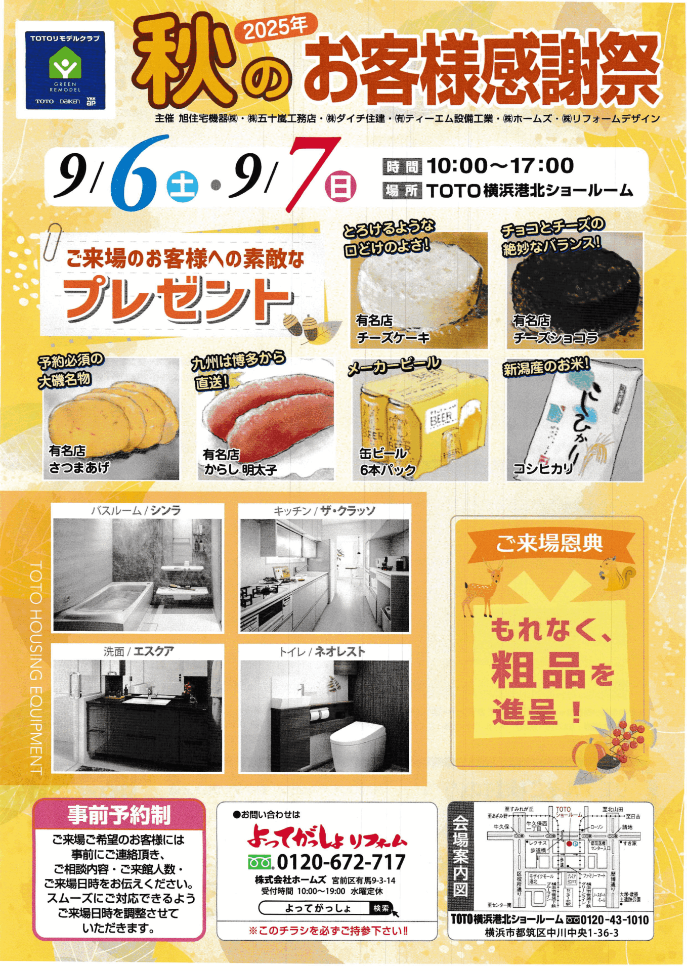 TOTO横浜港北ショールームと提携して相談会を開催させていただいており、この度日頃の感謝を込めてTOTOお客様感謝祭が開催されます。